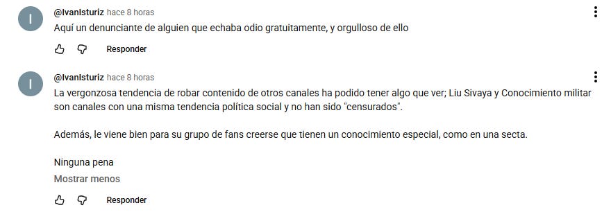 Dicen en los comentarios de la publicación de la entrevista de hoy en El Canal del Coronel que Youtube no censura por apoyar a Rusia porque hay canales como Conocimiento Militar o Liu Sibaya. Afirman que nuestra censura se debe a “que robamos contenido de otros”.